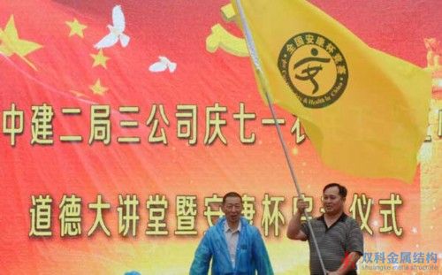 活動過程中,中建二局三公司十堰萬達(dá)項目部工地開展了慶“七一”農(nóng)民工“三心”(自信心、責(zé)任心、進(jìn)取心)道德教育,同時啟動了2015年“安康杯”活動。十堰市總工會對中建二局進(jìn)行了授旗。