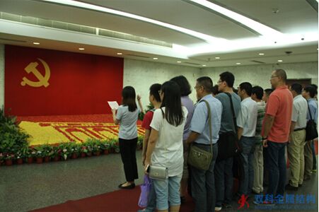 公司2名今年新發展的黨員,面對鮮紅的黨旗,舉行了莊嚴的入黨宣誓儀式。參加活動的黨員也一起舉起右臂,重溫了“入黨誓詞”。接著,由公司黨總支書記朱虹同志為在今年“創先爭優”活動中評選出的“2014-2015年度公司先進黨支部和優秀共產黨員”頒發了榮譽證書。最后,全體黨員跟隨著講解員的講解,懷著虔誠與激動的心情參觀了一大會址紀念館,并參觀了女紅軍事跡展。