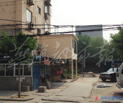 在現場記者發現,正對閣樓的一樓是一所教育機構,雖然被全面“包圍”,但一樓房主并沒有制止這種行為。采訪時,二樓的閣樓正在施工,不僅如此,為了施工方便,房主和工人在樓旁空地處搭建了藍色彩鋼房。據附近市民稱,“正在施工的樓房是祥和里404樓,大概是5月初開始施工。估計樓主是想擴大一下生活面積,才開始建的。不過,我們都覺得這樣做太危險。”正當記者準備詢問屋主違建房屋的詳細情況時,屋主卻避而不說,同時要求記者刪除所拍攝的照片,并稱,“以前就有人拍過,可能傳到了網上,太厭惡了。”